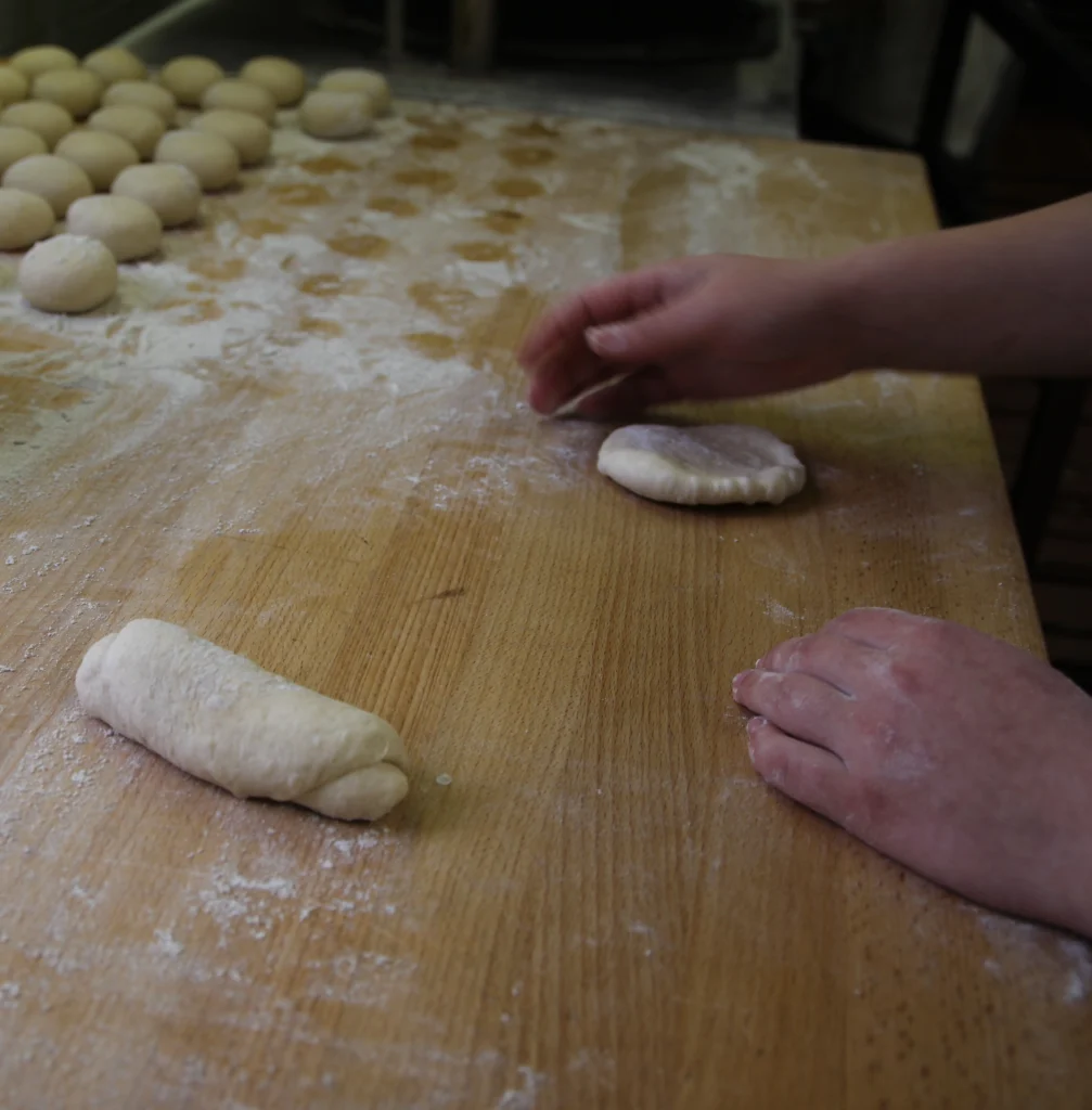 Bei uns wird jeder Teig per Hand abgewogen, geformt und verarbeitet – keine Maschinen, nur echtes Bäckerhandwerk. Auch Kuchen schneiden wir präzise von Hand, ganz ohne Schneidemaschine.